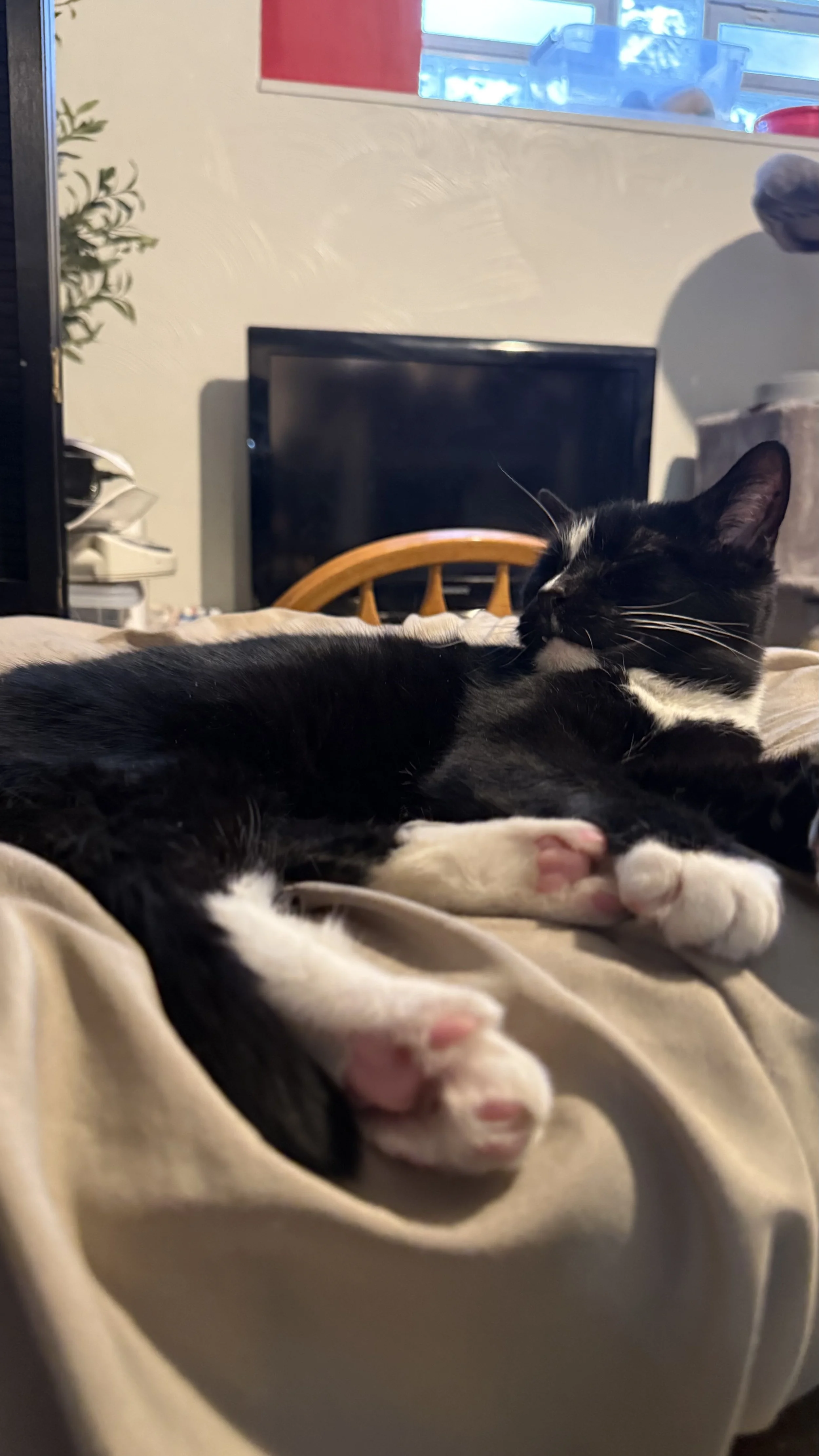 Symphony is a sweet old man who is looking for a quiet place to land and enjoy his golden years. He spent the majority of his life outdoors, but was taken into care when a neighbor made threats against his colony. He has been in foster since September of 2025, settling into indoor life with surprising calm. During his time in foster, he has reconnected with two members of his old colony: Morgan and Pixie. These three pals love to hang out together, sharing naps and gentle companionship, and would ideally find a forever home where they can stay together.